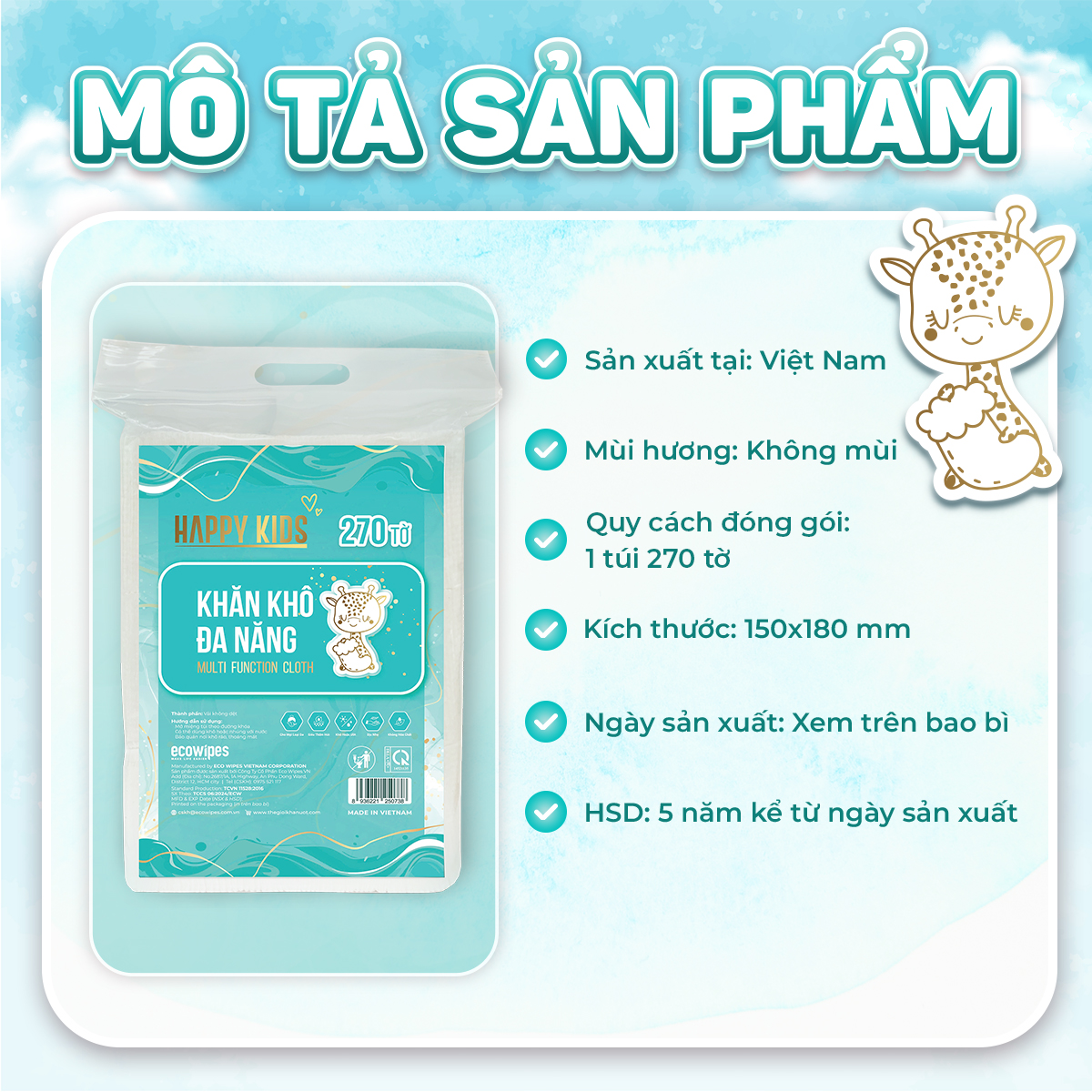 Khăn khô đa năng Happy Kids 270 tờ là sản phẩm lý tưởng cho những gia đình có trẻ nhỏ, mang lại sự an toàn và tiện lợi trong việc chăm sóc bé. Với chất liệu mềm mại, không chứa hóa chất gây hại, Happy Kids là lựa chọn an toàn để lau mặt, lau miệng khi bé ăn, lau tay chân, và vệ sinh khi thay tã hoặc tắm cho bé. Không chỉ dành cho trẻ em, sản phẩm này còn có thể thay thế khăn mặt hàng ngày, thấm khô sau khi rửa mặt, hoặc làm khăn ăn, khăn vải truyền thống. Khăn khô Happy Kids cũng phù hợp để sử dụng làm bông tẩy trang, đắp toner, và vệ sinh khu vực bếp cùng các vật dụng trong gia đình. Với 270 tờ trong mỗi gói, sản phẩm mang đến sự tiện lợi và tiết kiệm cho mọi gia đình.